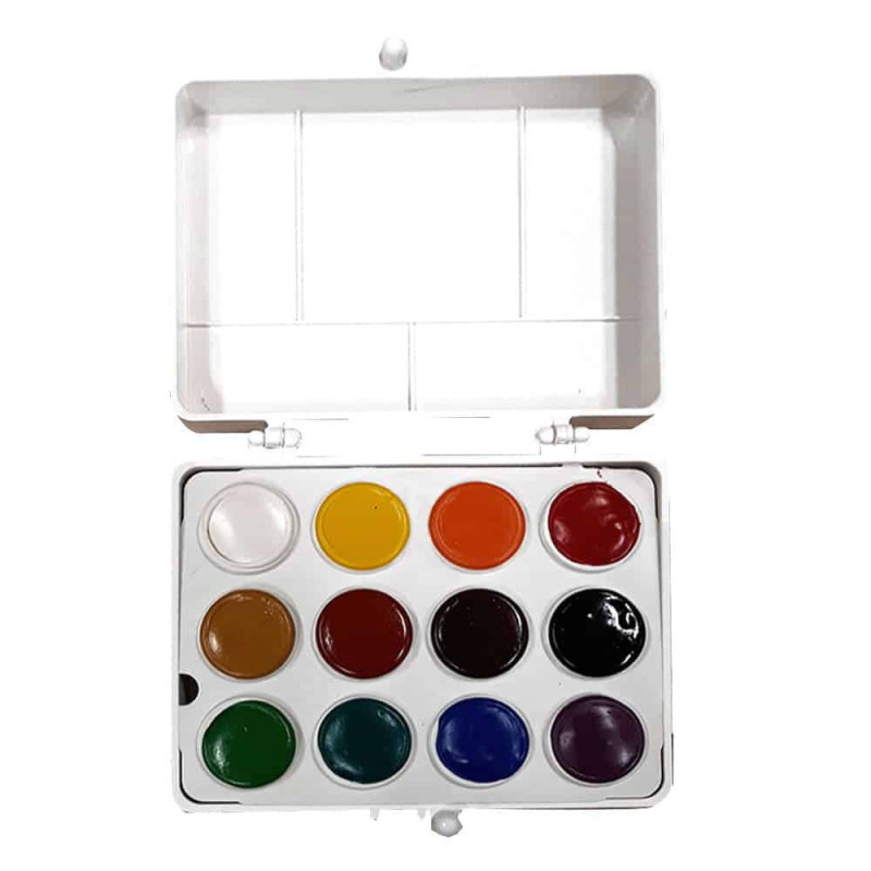 Set de acuarele Colibri cu 12 culori tip pastila, produs in Romania. Acuarele traditionale utilizate in scoli pentru activitati artistice si exercitii de baza.