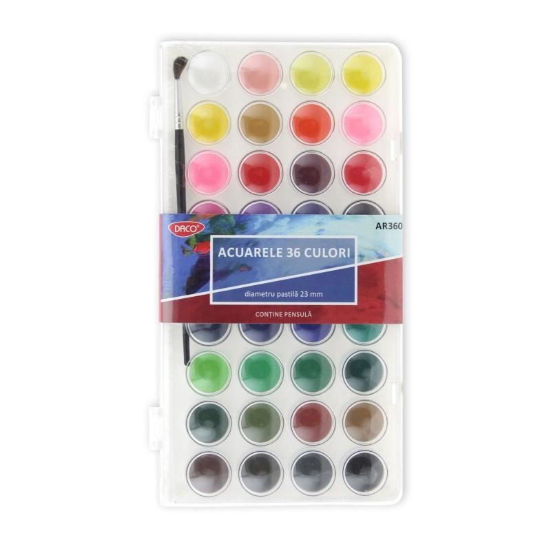 Setul de 36 culori acuarela Daco ofera o paleta extinsa de nuante potrivita pentru copii si elevi care invata sa utilizeze culorile pe baza de apa. Formatul tip pastila permite activarea rapida a culorilor cu apa si aplicarea usoara pe hartie de desen sau hartie pentru acuarela.