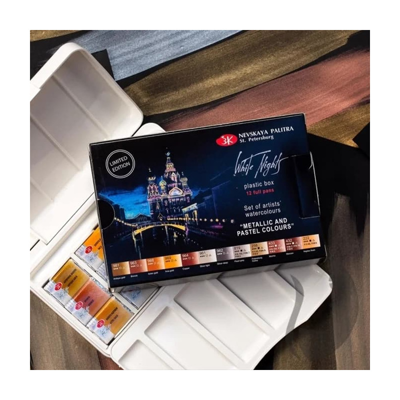 Setul de acuarele White Nights include 12 culori atent selectate din gamele metalice și pastel, oferind o paletă diferită față de acuarelele clasice. Culorile metalice creează efecte reflectorizante, iar cele pastel adaugă tonuri mai opace și delicate în compoziții.