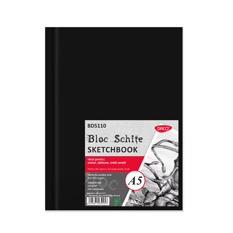 Blocul de schițe Daco A5 conține 110 file din hârtie de 110g/mp, oferind un suport practic pentru exerciții de desen, schițe rapide sau idei vizuale. Gramajul permite trasarea liniilor clare și realizarea desenelor fără încărcarea excesivă a hârtiei.