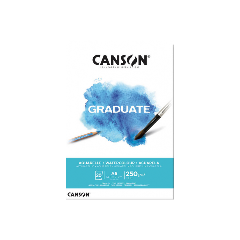 Blocul Canson Graduate Aquarelle A5 conține hârtie pentru acuarelă cu gramaj de 250g/mp și textură medie (cold pressed), fiind o alegere potrivită pentru studenți, începători și pasionați care doresc o hârtie fiabilă pentru exerciții și dezvoltarea tehnicii.