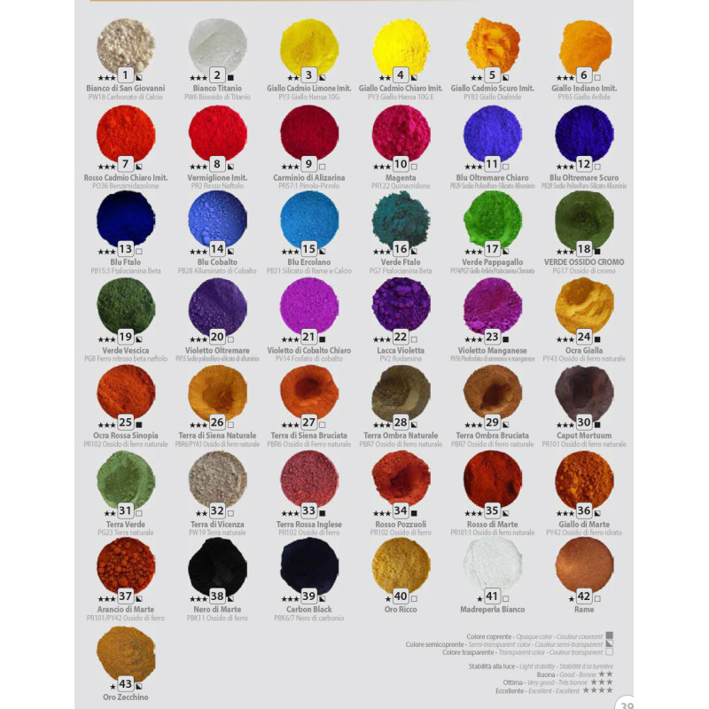 Pigmenții oferă intensitate cromatică ridicată și permit ajustarea consistenței culorii în funcție de proporția de liant utilizată. Sunt potriviți pentru pictură artistică, restaurare, mixed media sau proiecte decorative unde este necesară obținerea unor nuanțe specifice.