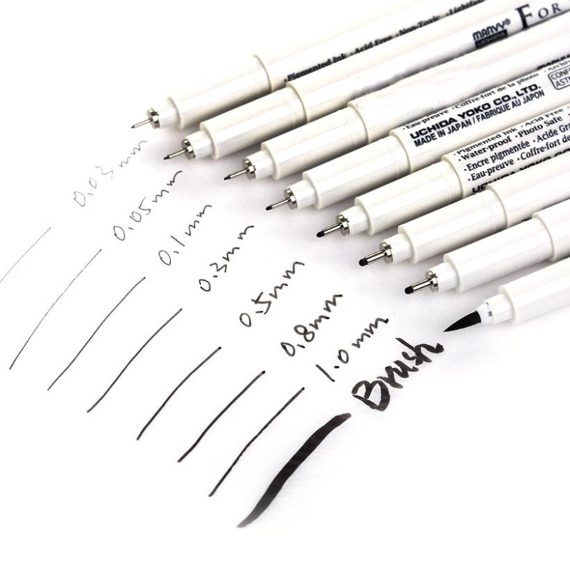 Vârful ferm oferă o linie constantă, fiind potrivit pentru ilustrație, schițe, bullet journal sau desen grafic. Diferitele grosimi disponibile permit variația stilului de lucru și realizarea de compoziții detaliate.